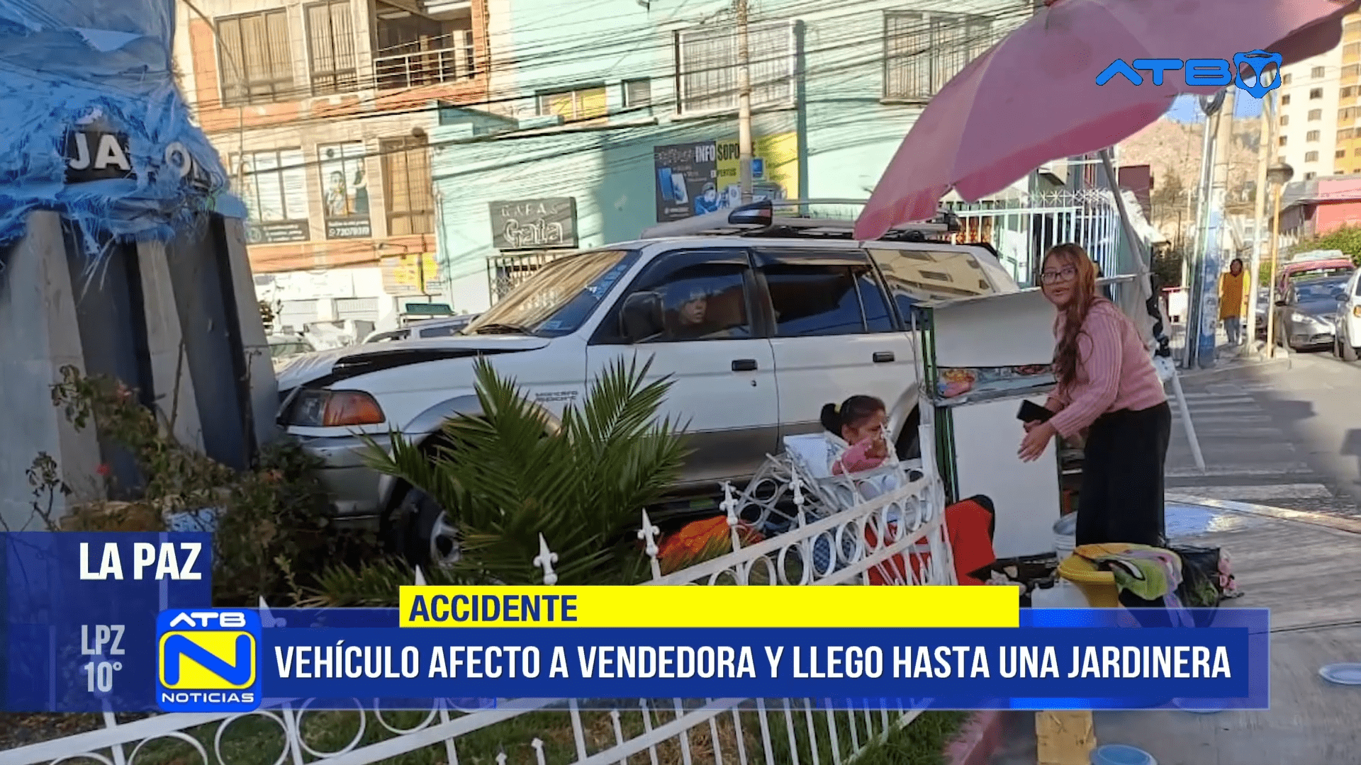 La Paz, 11 de oct 2025 (ATB Digital) .- Un vehículo perdió el control y se subió a la acera en la zona de Miraflores, quedando incrustado en una jardinera y pasando a pocos centímetros del carrito de desayunos de la señora Rosalina. La vendedora sufrió un golpe, así como daños materiales, mientras Tránsito investiga las causas del accidente ocurrido cerca de las 8 de la mañana.