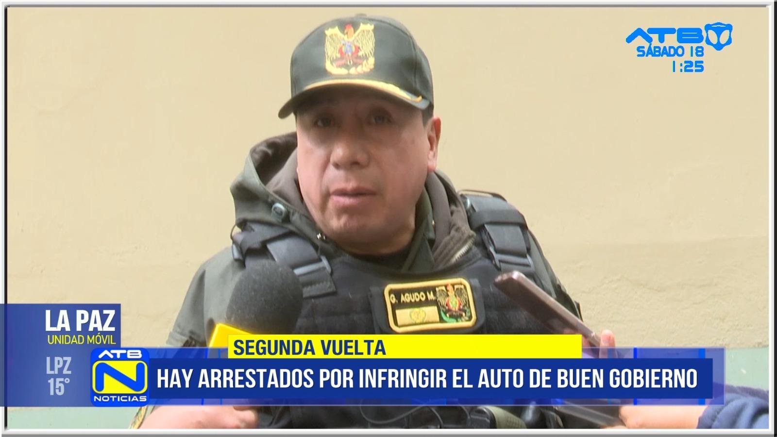La Paz, 18 de oct 2025 (ATB Digital).- El comandante departamental de la Policía de La Paz, Gunther Agudo, informó sobre los operativos de control realizados en el marco del auto de buen gobierno, que ya se encuentra en aplicación previa a la segunda vuelta electoral del domingo 19 de octubre. Según el reporte, 165 personas fueron sorprendidas consumiendo bebidas alcohólicas, infringiendo las disposiciones vigentes.