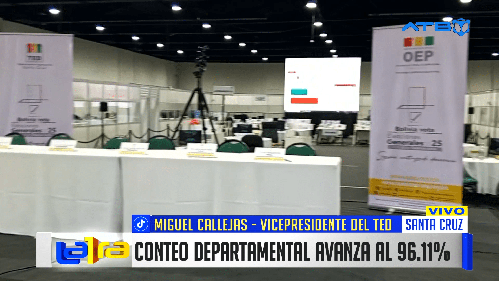 Santa Cruz, 21 de oct 2025 (ATB Digital).- Desde el Centro de Cómputo Electoral de Santa Cruz, el vicepresidente del TED, Miguel Callejas, informó que el conteo departamental avanza en un 96,11% y se prevé que culmine al mediodía.