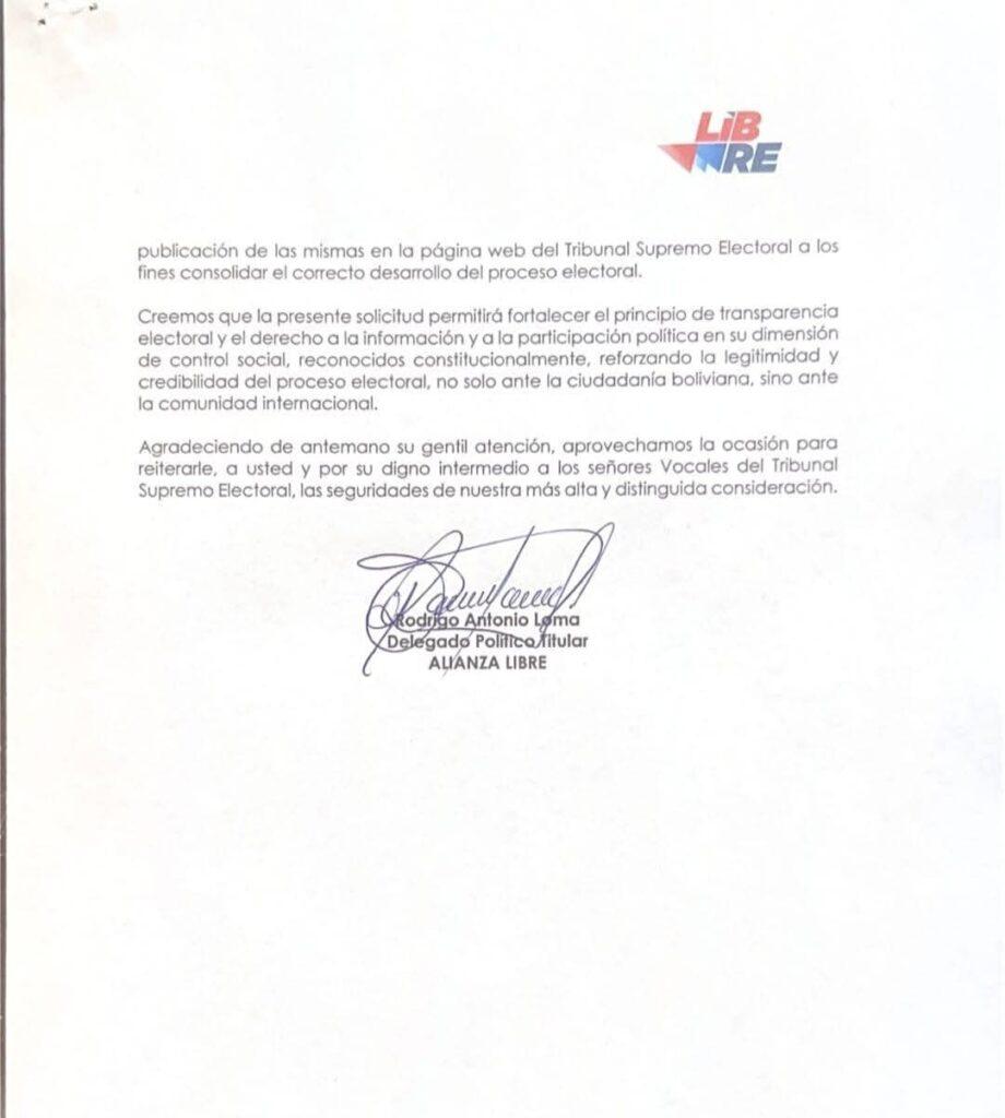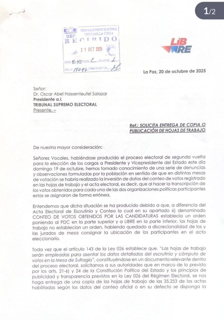 La Paz, 21 de oct 2025 (ATB Digital).- La alianza Libre solicitó al Tribunal Supremo Electoral (TSE) la entrega de copias de hojas de trabajo de 35.253 actas electorales del balotaje, con el objetivo de realizar una “auditoría interna” y definir una posición sobre los resultados finales.