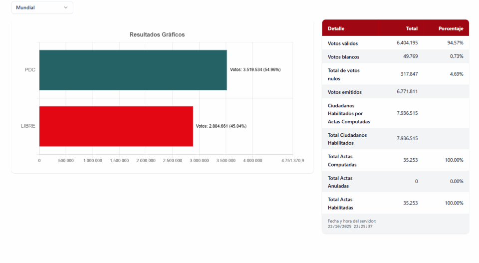 La Paz, 22 de oct 2025 (ATB Digital).- El Tribunal Supremo Electoral (TSE) concluyó este miércoles el cómputo oficial de la segunda vuelta presidencial, con lo que se confirmó la victoria de Rodrigo Paz Pereira y Edmand Lara, quienes obtuvieron el 54,96% de los votos válidos frente al 45,04% alcanzado por Jorge “Tuto” Quiroga.
