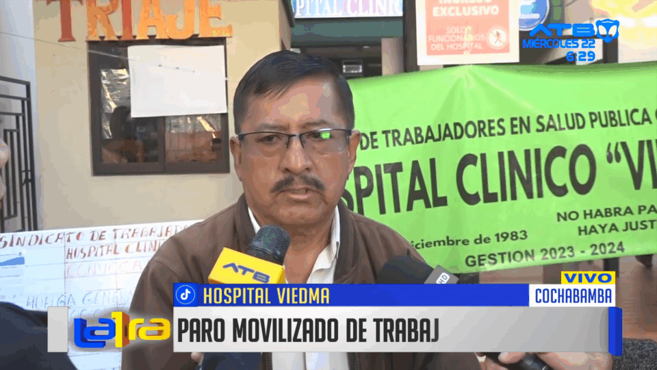 Cochabamba, 22 de oct 2025 (ATB Digital).- En Cochabamba, trabajadores del Hospital Viedma iniciaron un paro movilizado exigiendo el pago del bono de té.