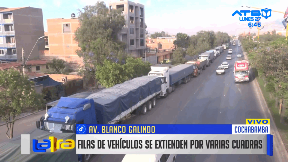 Cochabamba, 27 de oct 2025 (ATB Digital).- Desde la avenida Galindo en Cochabamba, se observan varias cuadras de camiones que aguardan por abastecerse de diésel. La demanda supera la oferta disponible y los transportistas expresan preocupación por los retrasos que esto genera en su trabajo y en el traslado de productos esenciales.