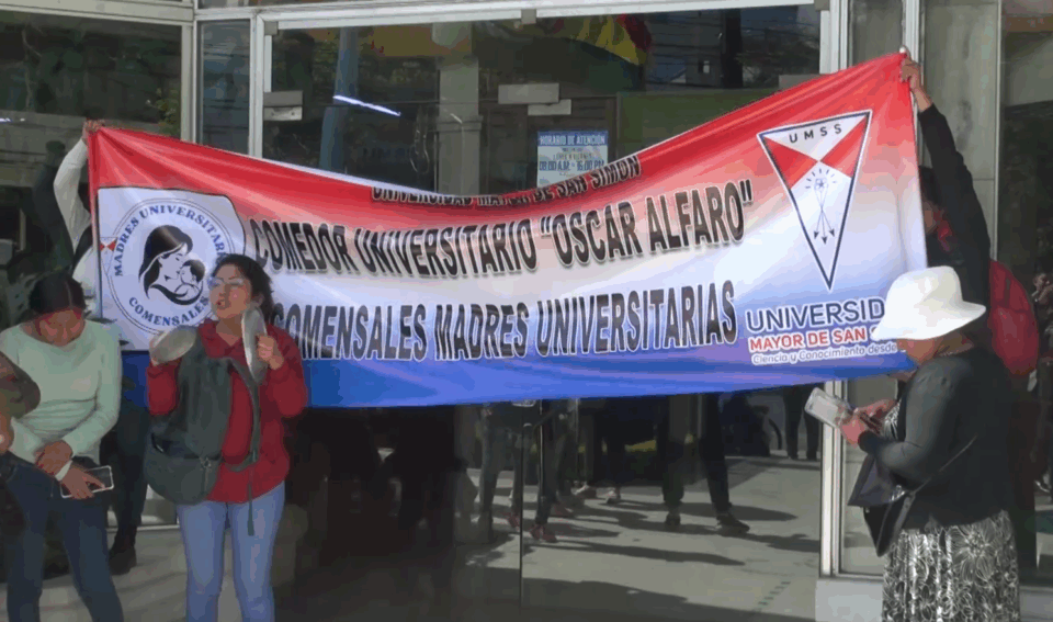 Cochabamba, 28 de oct 2025 (ATB Digital) .- Un grupo de 120 representantes del comedor universitario de la Universidad Mayor de San Simón tomó el rectorado en protesta, exigiendo el pago inmediato del bono comedor que se les adeuda desde marzo. Las manifestantes, entre ellas madres universitarias, advierten con iniciar una huelga de hambre si las autoridades no responden a sus demandas.