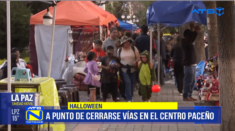 La Paz, 31 de oct 2025 (ATB Digital)-. Hoy se registran cortes de vías en el centro de La Paz debido a la instalación de ferias con una gran variedad de puestos de maquillaje, dulces y disfraces. Desde la calle San Francisco hasta la plaza del Estudiante, los comerciantes ofrecen todo tipo de productos para que los más pequeños elijan su disfraz y participen de las celebraciones de Halloween y Todos Santos.
