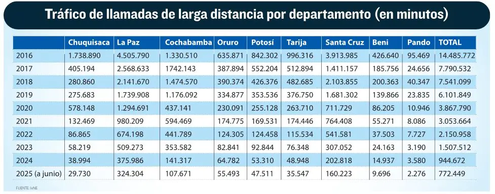 De hecho, en la gestión 2016 el tráfico de llamadas de larga distancia a nivel nacional era de 14.485.772 minutos, mientras que, a junio de este 2025, la cifra asciende a 772.449 minutos.