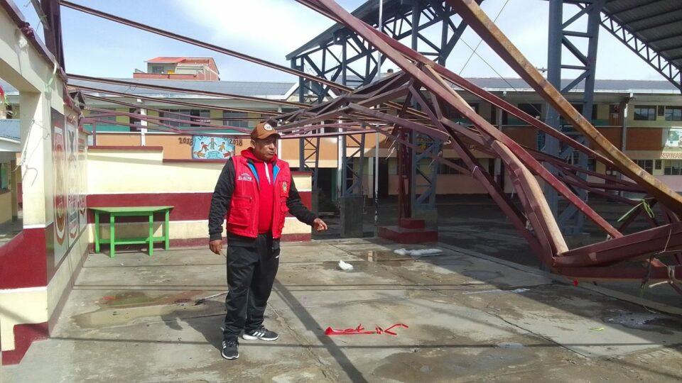 «El granizo ha dañado toda la estructura de este proscenio, entonces nosotros hemos intervenido anoche para retirar toda la calamina de este proscenio, y este lunes vamos a continuar para poder retirar toda la estructura», informó el secretario Municipal de Educación y Cultura, Edgar Añaguaya.