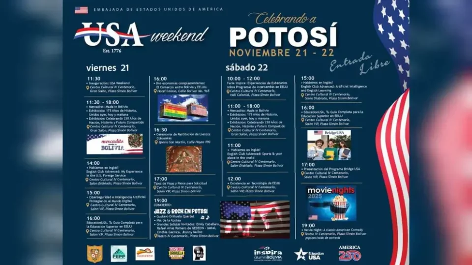 Potosí, 19 de nov 2025 (ATB Digital).- Potosí se prepara para vivir un aniversario distinto. En el marco de las celebraciones por su mes aniversario y el bicentenario de Bolivia, la histórica ciudad será escenario del “USA Weekend, celebrando a Potosí” dos intensas jornadas culturales y educativas, organizadas por la Embajada de Estados Unidos, que unirán música, cine, emprendimiento, formación académica y la devolución de dos valiosas pinturas coloniales redescubiertas con la ayuda de Estados Unidos. El programa se desarrollará los días 21 y 22 de noviembre en el Teatro IV Centenario (Plazuela Bolívar).