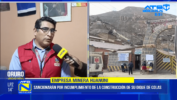 Oruro, 26 de nov 2025 (ATB Digital)-. En Oruro, la empresa minera Huanuni enfrentará sanciones por poner en riesgo el medio ambiente tras no cumplir las obras y medidas correctivas relacionadas con el dique de colas de Santa Elena. Según Olson Paravicini, secretario de Medio Ambiente, una inspección confirmó el incumplimiento, por lo que se notificó el inicio de una resolución que definirá la sanción correspondiente.