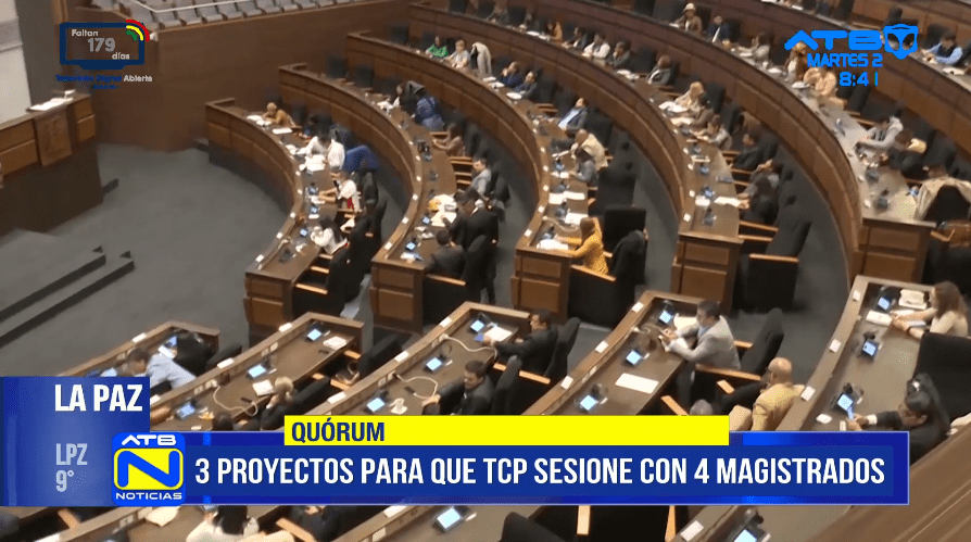 La Paz, 02 de dic 2025 (ATB Digital).- Continúan sumándose proyectos de ley que plantean permitir el funcionamiento del Tribunal Constitucional Plurinacional (TCP) con un quórum mínimo de cuatro magistrados. Legisladores adelantaron que estas propuestas serán debatidas esta semana, con el fin de reactivar plenamente las funciones del Órgano Judicial tras la salida de los magistrados considerados “autoprorrogados”.