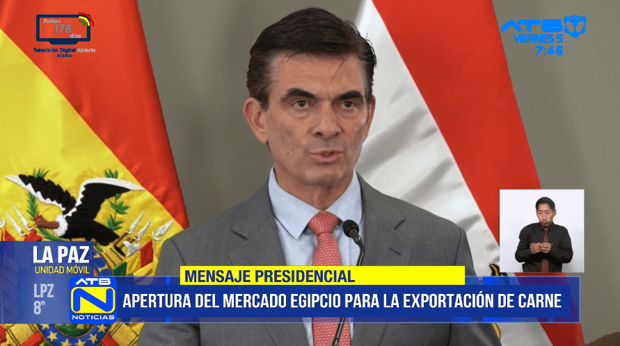 La Paz, 05 de dic 2025 (ATB Digital).- El presidente Rodrigo Paz anunció la apertura de un nuevo mercado internacional para la carne boliviana.