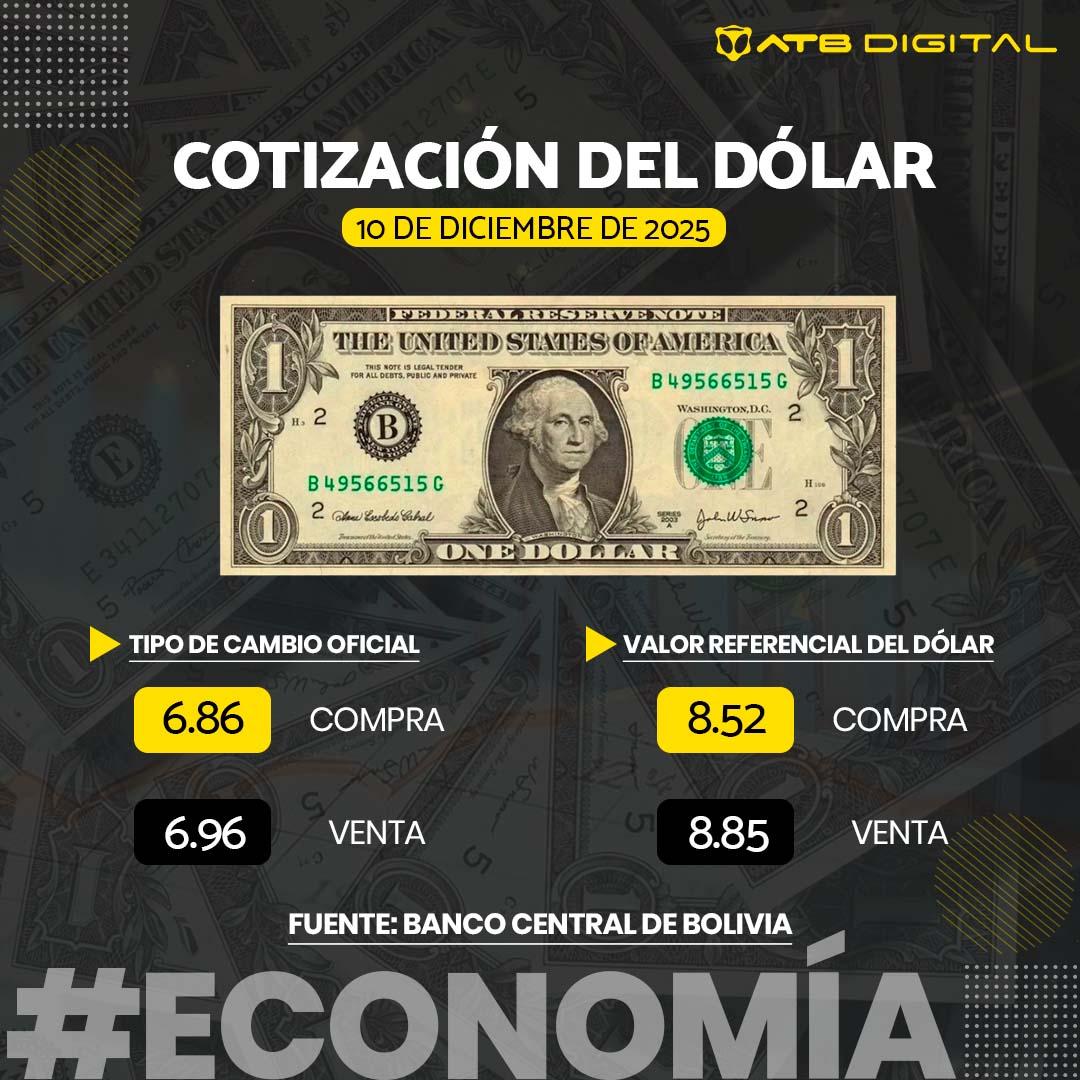 EconomíaCotización del dólar: 10 de diciembre 2025 diciembre 10, 2025diciembre 10, 2025 Compartir 🔊 Escuchar la nota La Paz, 10 de dic 2025 (ATB Digital).- El Banco Central de Bolivia (BCB) publicó el tipo de cambio referencial del dólar para este miércoles 10 de diciembre. Aquí te lo presentamos. Fuente: Banco Central de Bolivia