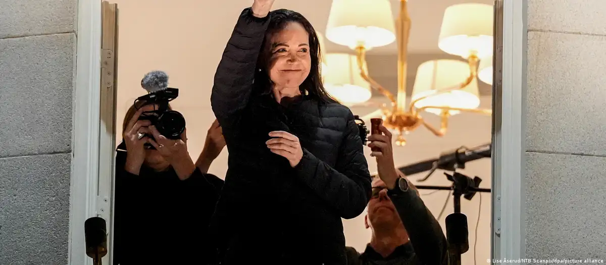 La ganadora del Nobel de la Paz 2025, llegó a Noruega horas después de la ceremonia de entrega del premio, después de más de un año casi todo el tiempo escondida y desafiando una prohibición de viajar que dura ya una década.