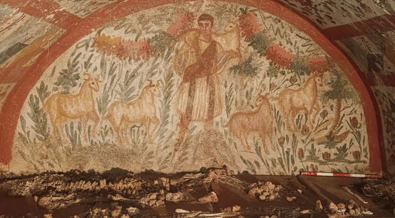 Dentro de la tumba hipogea -construcción subterránea con forma de bóveda- se encontraba un féretro hecho de losas cuadradas de terracota, junto al cual se halla el singular fresco en un estado de conservación excepcional. La imagen representa a un Jesús joven, cargando una oveja sobre sus hombros.