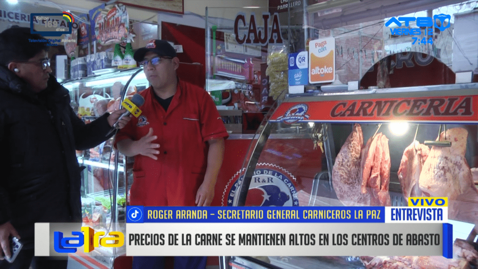 La Paz, 12 de dic 2025 (ATB Digital).- Roger Aranda, secretario general de los carniceros de La Paz, señaló que los precios de la carne se mantienen altos en los centros de abasto. Exigen priorizar el abastecimiento del mercado interno antes de la exportación y advierten que podrían iniciar un paro si no se atienden sus demandas.
