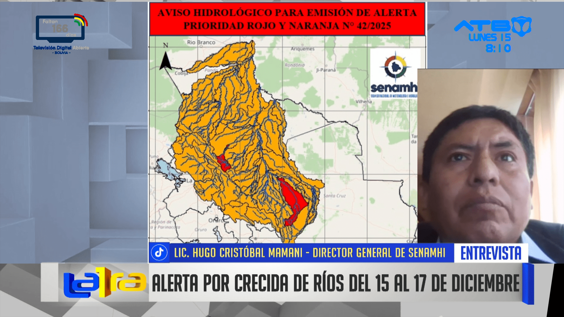 La Paz, 15 de dic 2025 (ATB Digital).- Hugo Cristóbal Mamani, director general de Senamhi en Bolivia, informó sobre la emisión de alertas roja y naranja por la crecida y posible desborde de ríos entre el 15 y 17 de diciembre. Se recomienda a la población mantenerse informada y tomar precauciones en zonas de riesgo.
