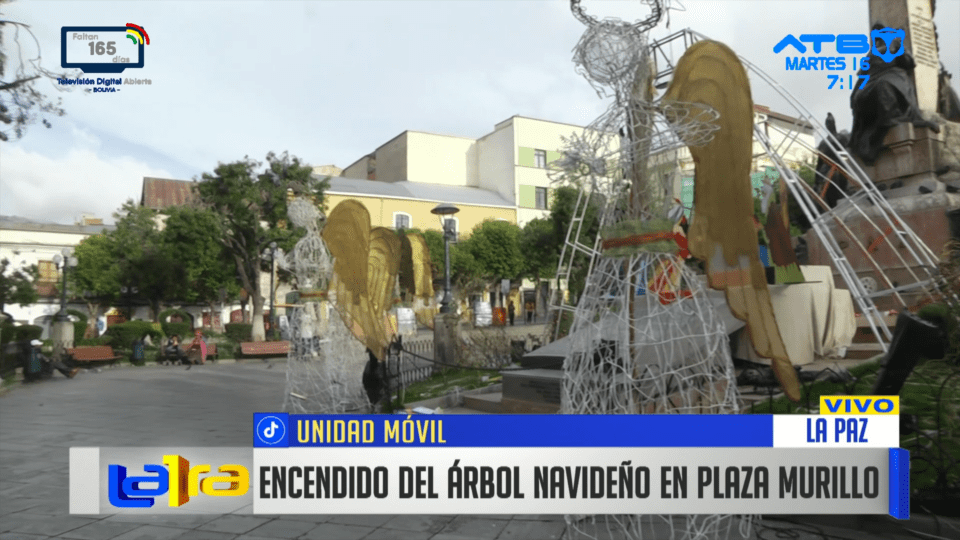 La Paz, 16 de dic 2025 (ATB Digital).- Este martes se realizará el encendido del árbol navideño en la plaza Murillo, en La Paz, Bolivia. La población debe tomar en cuenta que las vías aledañas y los accesos vehiculares a la plaza estarán cerrados por el evento. Para la noche se instaló un escenario y dos palcos, y el acto será inaugurado por el presidente junto a la primera dama. El Palacio de Gobierno y toda la plaza ya se encuentran decorados, invitando a la ciudadanía a asistir y disfrutar del encendido y las decoraciones navideñas.