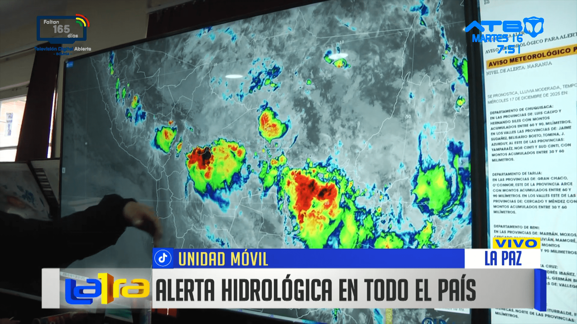 La Paz, 16 de dic 2025 (ATB Digital).- Desde el Senamhi se prevé alerta hidrológica en todo Bolivia, con avisos rojos y naranjas para Santa Cruz, Cochabamba y Beni. Se advierte sobre posibles desbordes de ríos, fuertes vientos y lluvias intensas en las próximas horas. La población debe mantenerse informada y tomar precauciones ante estos fenómenos.