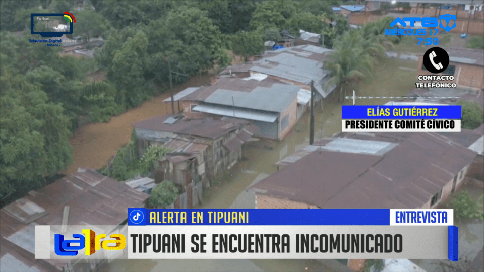 La Paz, 17 de dic 2025 (ATB Digital).- Elías Gutiérrez, presidente del Comité Cívico de Tipuani, informó que se realiza una coordinación constante entre la población y las autoridades para enfrentar los desastres naturales que afectan al municipio. Señaló que Tipuani se encuentra incomunicado, por lo que se trabaja de manera conjunta para atender la emergencia y resguardar a las familias afectadas.