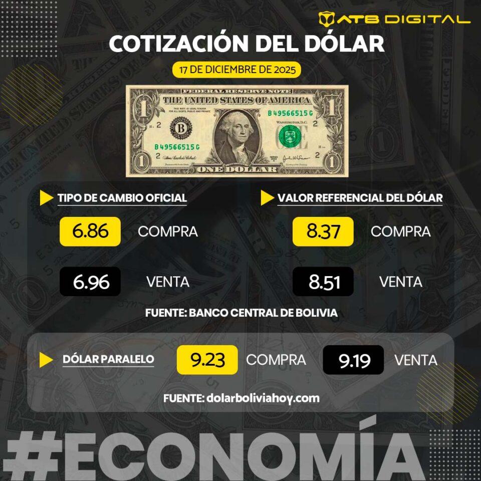 La Paz, 17 de dic 2025 (ATB Digital).- El Banco Central de Bolivia (BCB) dio a conocer el tipo de cambio referencial del dólar correspondiente a este miércoles 17 de diciembre. Asimismo, te presentamos la cotización del dólar en el mercado paralelo, de acuerdo con el portal dolarboliviahoy.com.