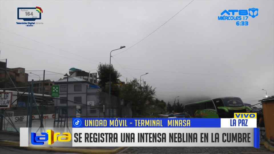 La Paz, 17 de dic 2025 (ATB Digital).- Se registra intensa neblina en el sector de La Cumbre, por lo que desde la terminal Minasa, en La Paz, Bolivia, recomiendan a conductores y pasajeros extremar las medidas de precaución y seguridad debido a las condiciones climáticas y las lluvias. Pese a ello, las salidas se realizan con normalidad. Asimismo, se refuerza el control de permisos de viaje para menores de edad ante la alta afluencia de pasajeros.
