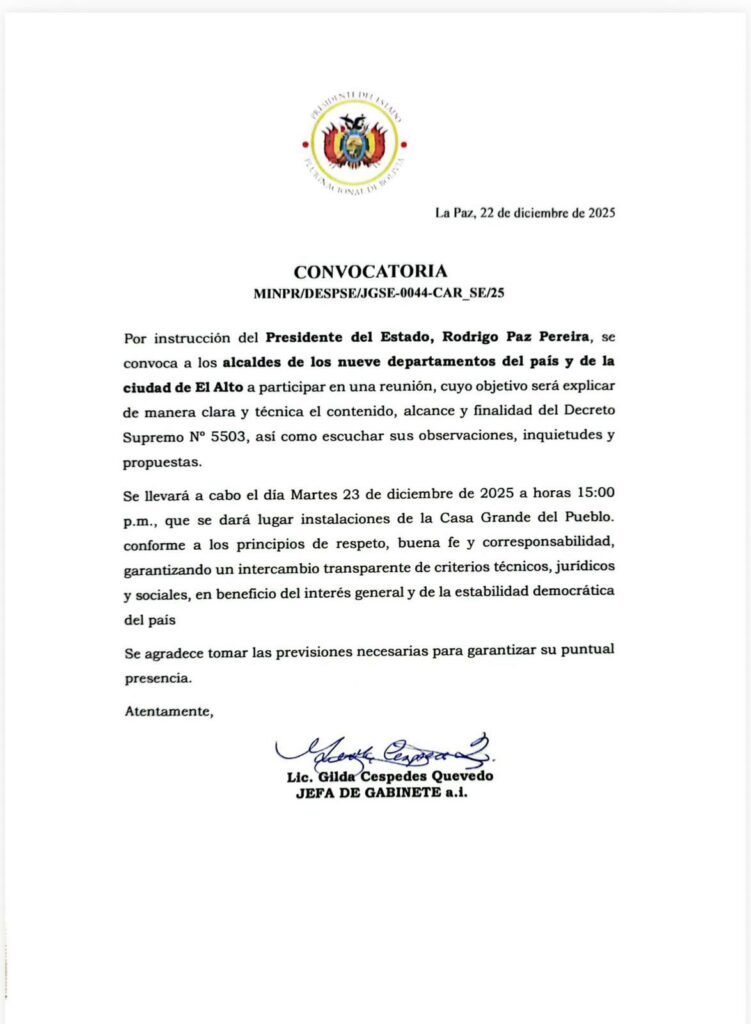 La Paz, 22 de dic 2025 (ATB Digital).- El presidente del Estado, Rodrigo Paz Pereira, convocó a los alcaldes de las capitales de los nueve departamentos y de la ciudad de El Alto a una reunión para analizar y explicar el Decreto Supremo 5503, de acuerdo con la convocatoria difundida este lunes.