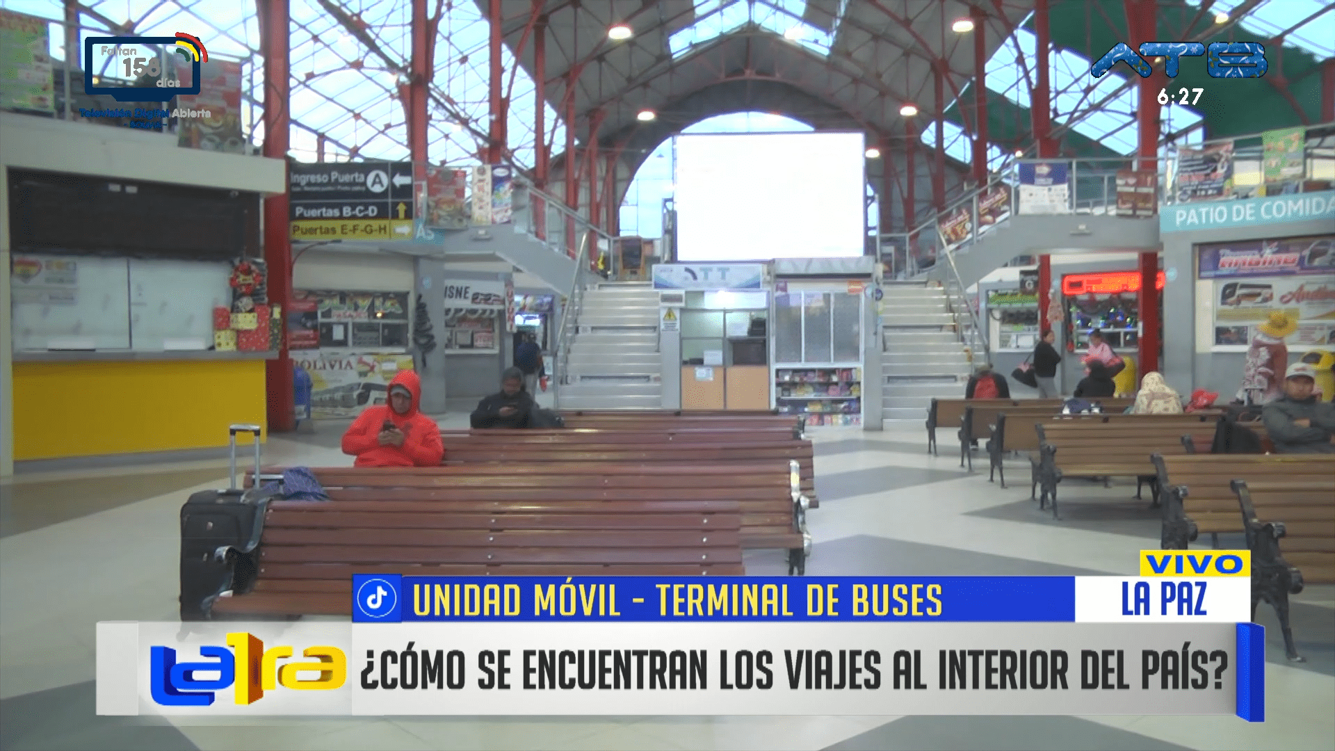 La Paz, 23 de dic 2025 (ATB Digital).- En la Terminal de Buses de La Paz, Bolivia, la afluencia de pasajeros es muy baja, principalmente por los bloqueos registrados en distintas rutas del país y el incremento irregular de tarifas. El precio tope autorizado es de Bs 110; sin embargo, algunos buses cobran hasta Bs 180. No existen salidas hacia Santa Cruz por la escasez de diésel y, hacia el occidente del país, las frecuencias también son limitadas ante el temor de nuevos bloqueos.