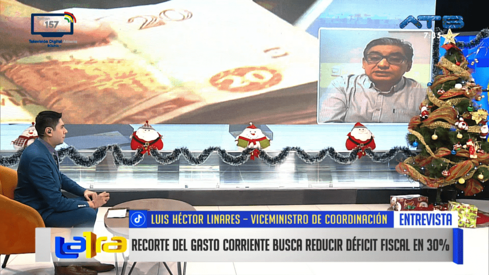 La Paz, 24 de dic 2025 (ATB Digital).- Luis Héctor Linares, viceministro de Coordinación, informó que el Gobierno impulsa un recorte del gasto público con el objetivo de reducir el déficit fiscal en un 30%, en el marco de la elaboración del Presupuesto General del Estado (PGE) 2026.