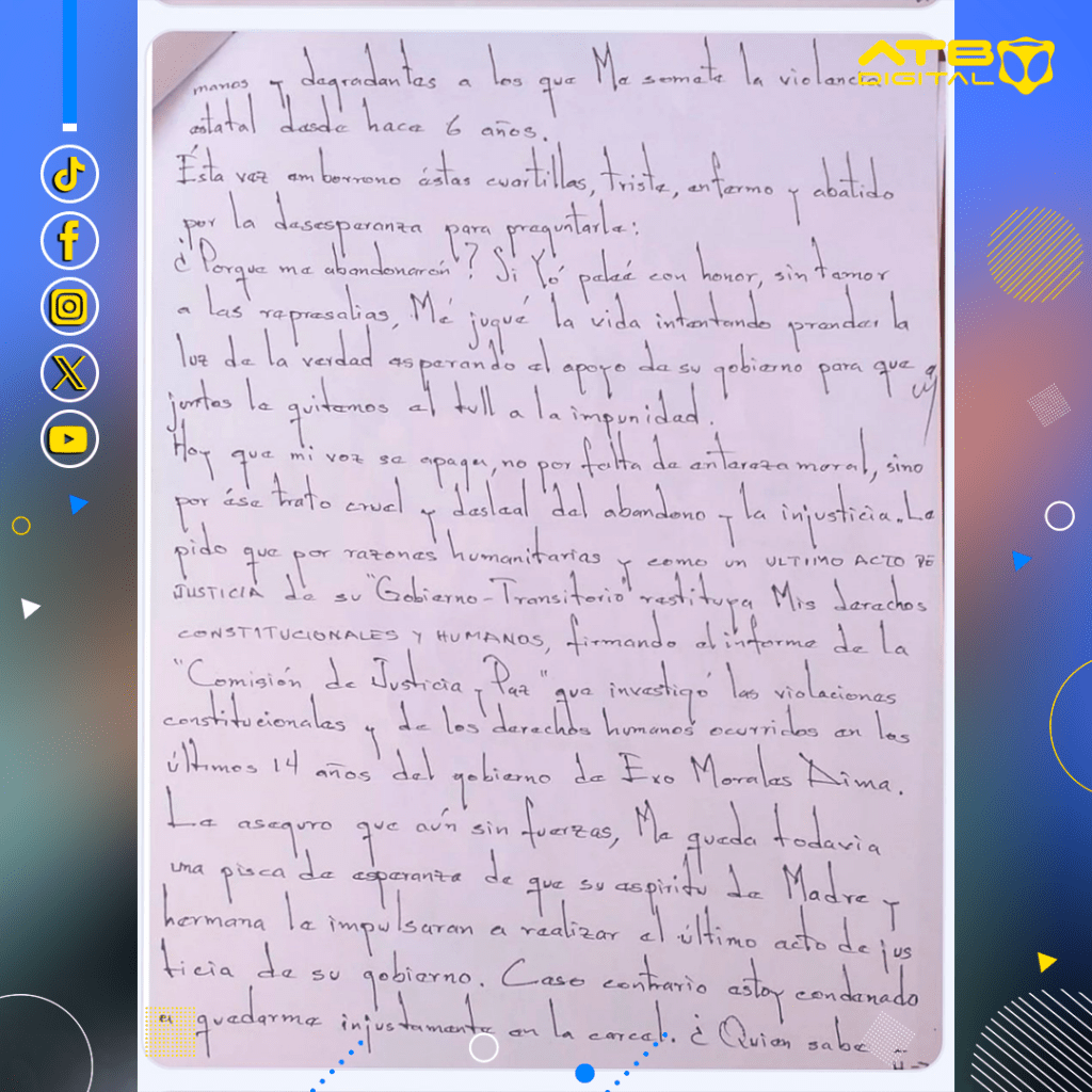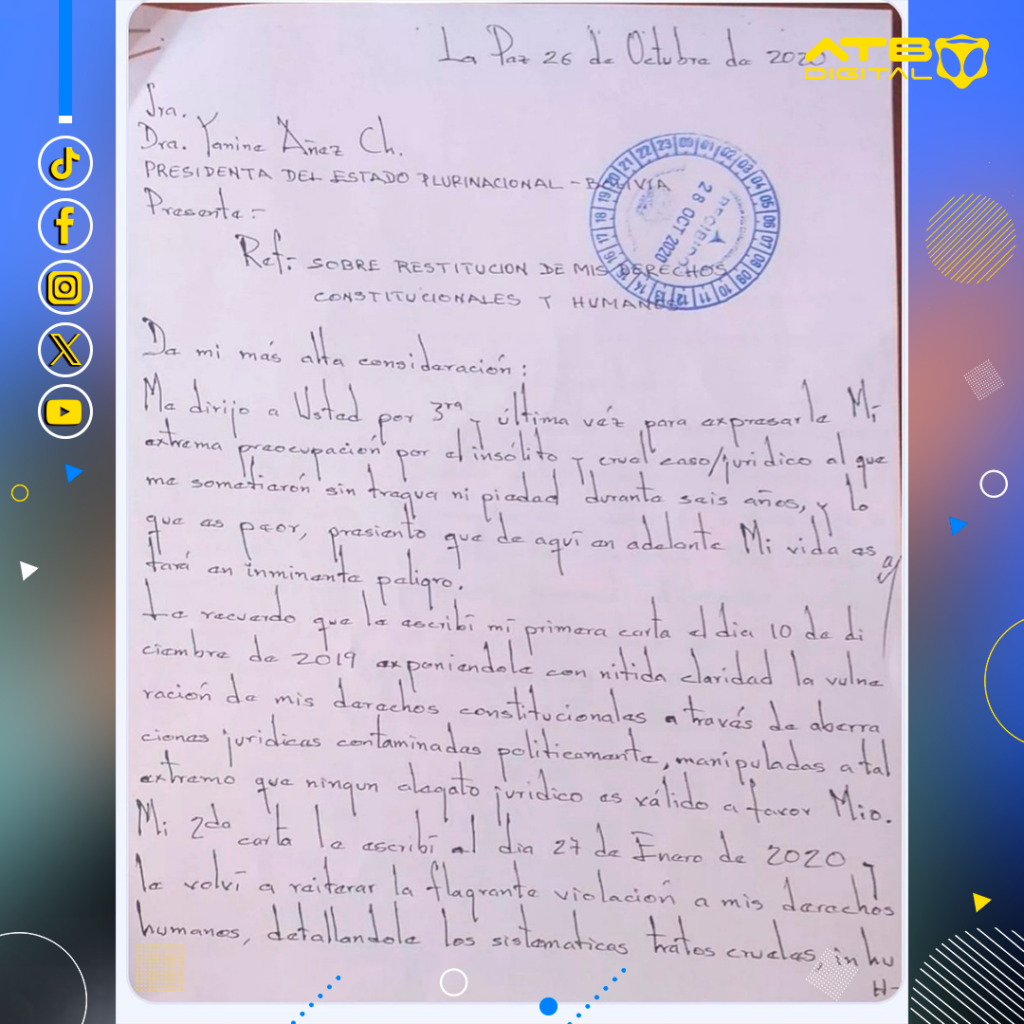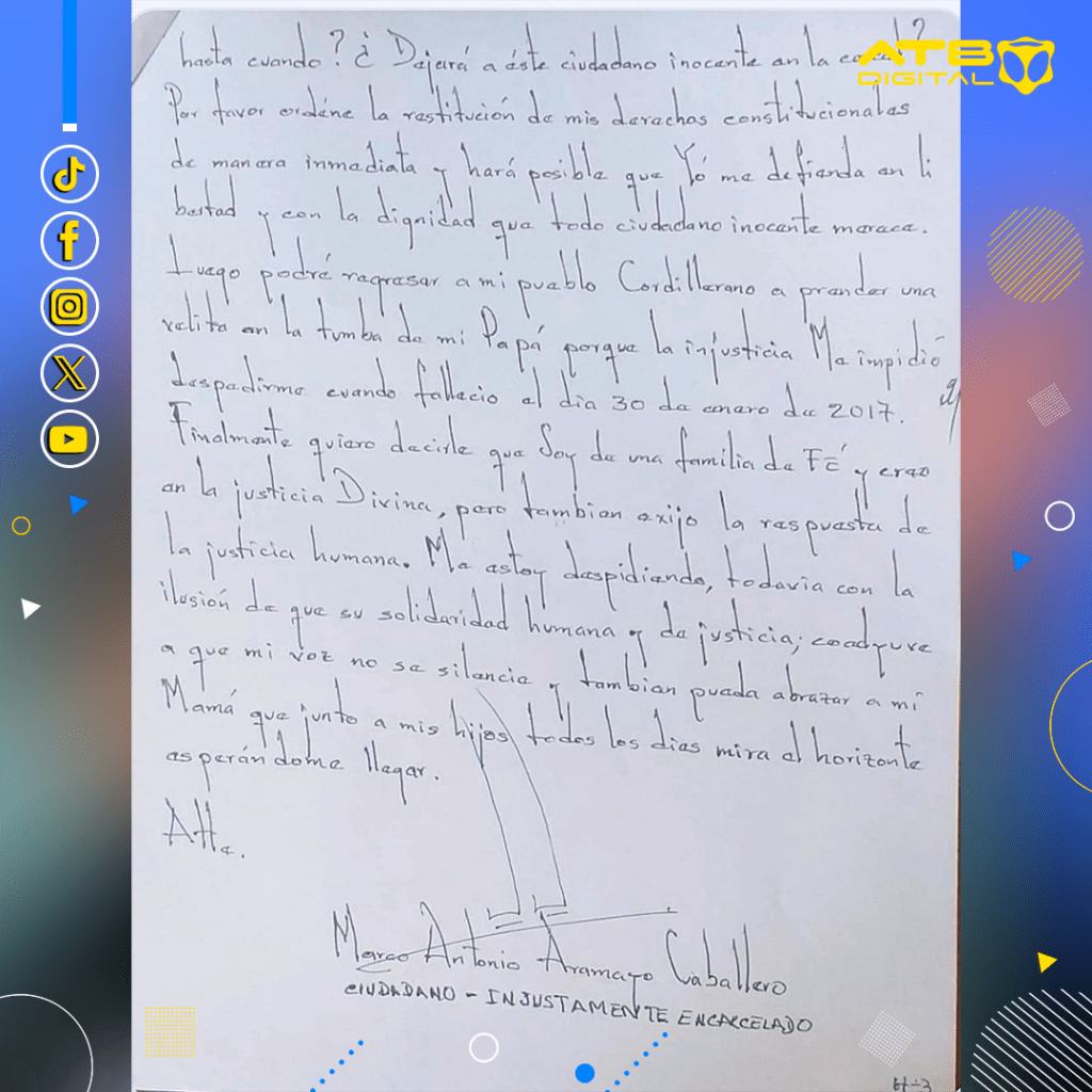La Paz, 24 de dic 2025 (ATB Digital) .- Marco Aramayo, quien falleció con 256 procesos en su contra tras su denuncia de corrupción en el extinto Fondo Indígena, habría escrito varias cartas pidiendo auxilio. Recientemente, mostraron los escritos de Aramayo en el año 2020 dirigidas hacia la entonces presidenta interina Jeanine Áñez Chávez.