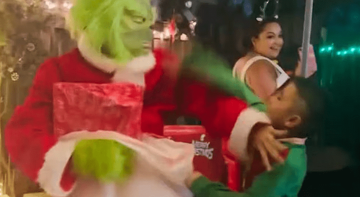 La reacción de los pequeños resulta tan espontánea como contundente. Al ver que el Grinch intenta llevarse los regalos, los niños, movidos por la sorpresa y la indignación, arremeten física y verbalmente contra el intruso. Varios de ellos se lanzan a golpearlo en un intento de recuperar sus obsequios y proteger la magia del momento. Uno de los niños, particularmente molesto por la situación, golpea con fuerza al Grinch y hasta intenta quitarle la máscara, en un esfuerzo por descubrir la verdadera identidad del responsable. Sin embargo, el hombre disfrazado logra mantener la máscara en su lugar, resistiendo los intentos de desenmascaramiento y evitando que su rostro quede expuesto.