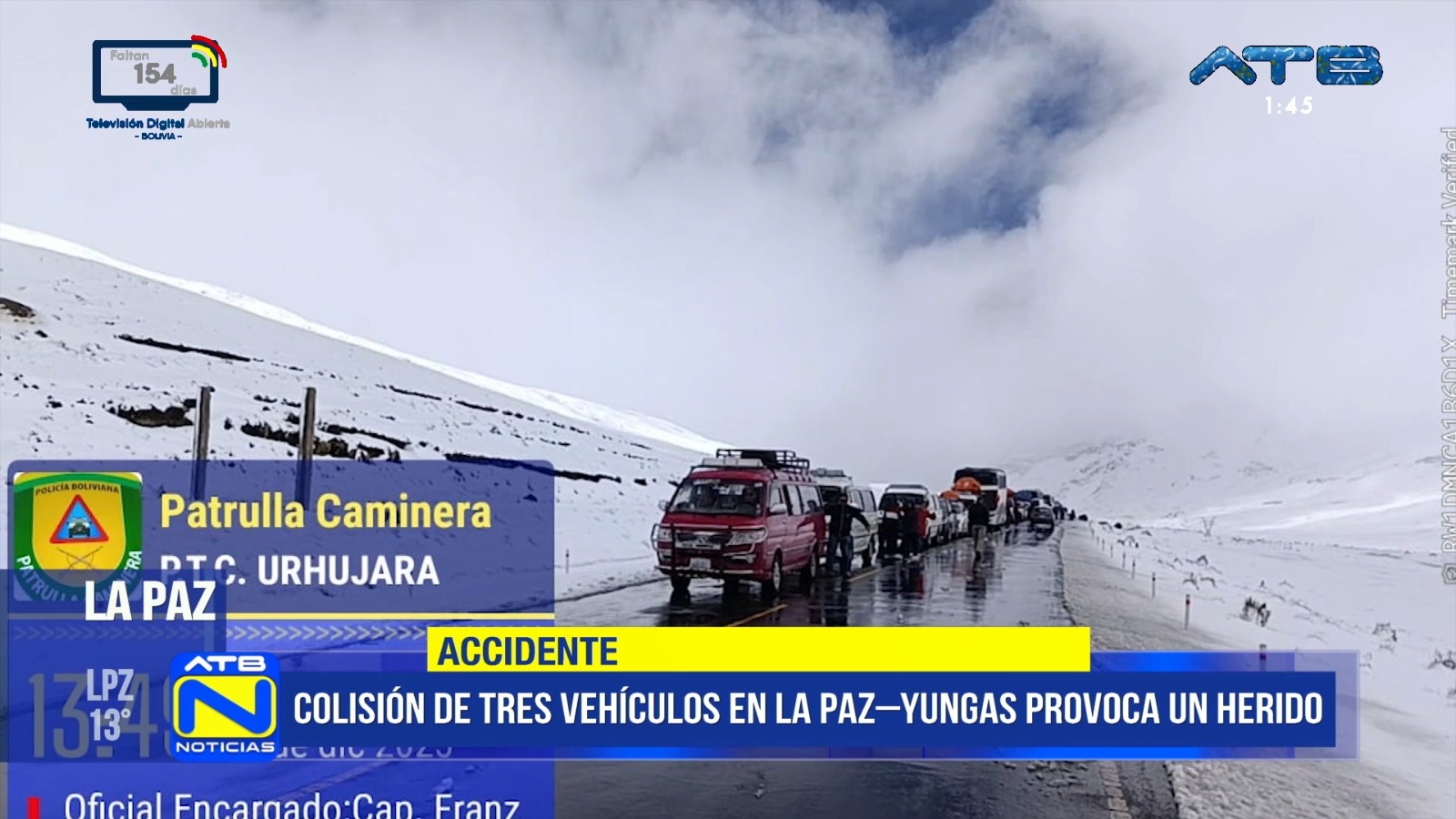 La Paz, 27 de dic 2025 (ATB Digital).- El subcomandante departamental de la Policía, Javier Salgueiro, informó sobre una colisión de tres vehículos registrada en la carretera La Paz–Yungas, hecho que dejó una persona herida.