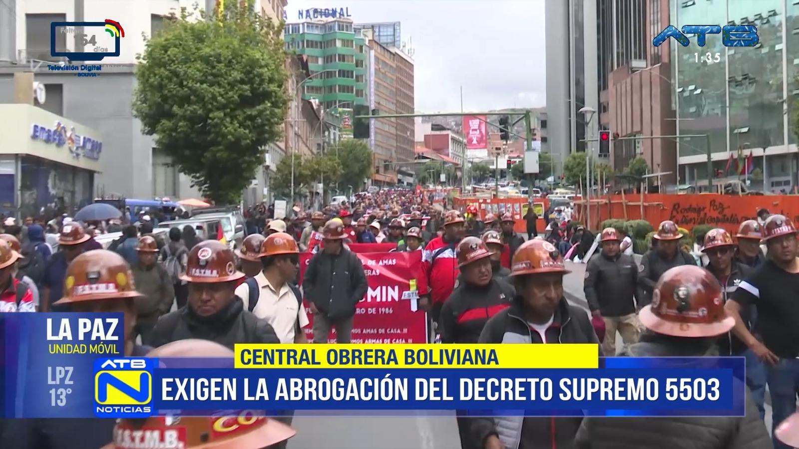 La Paz, 27 de dic 2025 (ATB Digital).- La Central Obrera Boliviana (COB) continúa este sexto día con protestas y movilizaciones en el centro de la ciudad de La Paz, en rechazo al Decreto Supremo 5503.