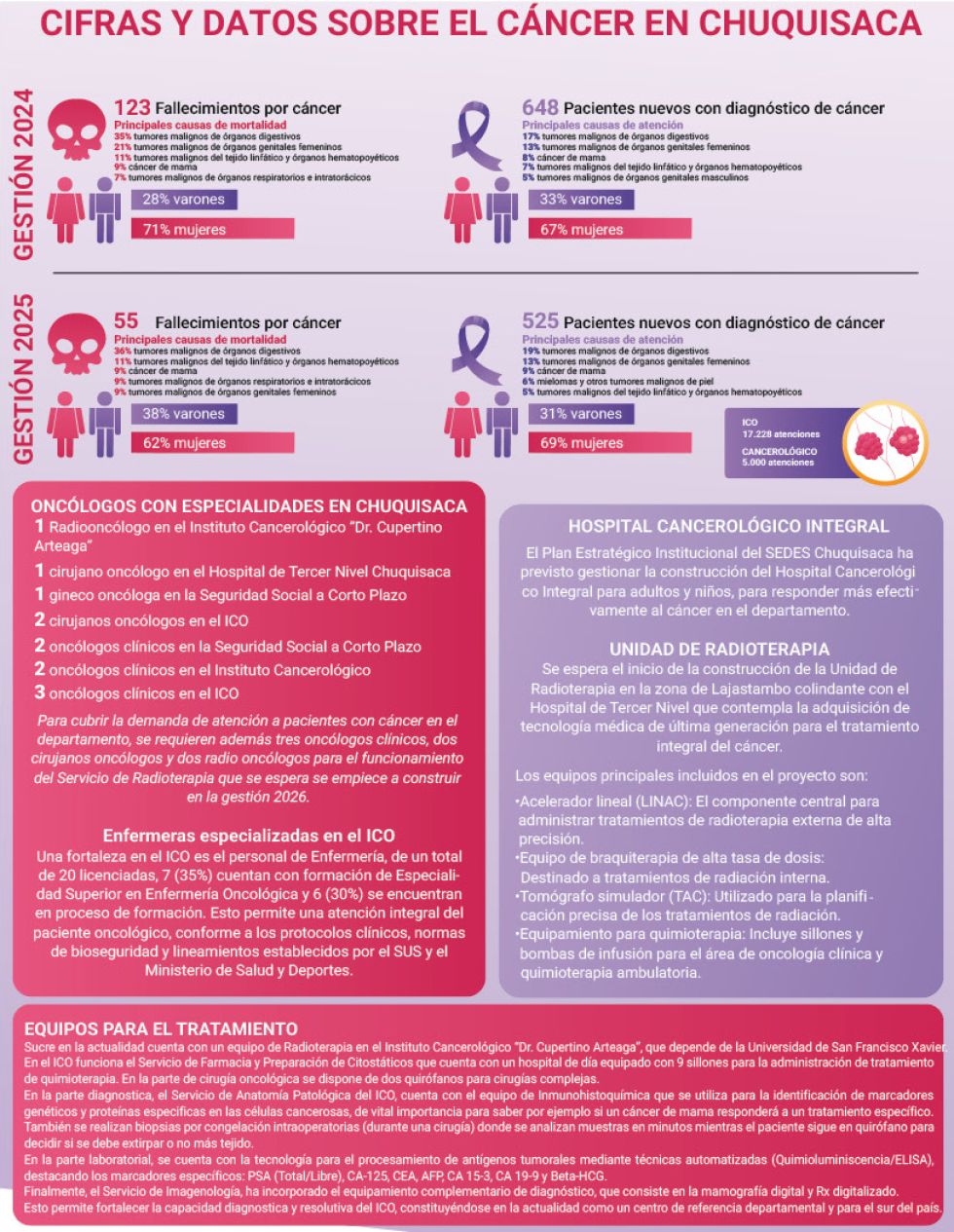 Chuquisaca, 28 de dic 2025 (ATB Digital).- Chuquisaca redujo a menos de la mitad la cifra de muertes por cáncer, una enfermedad que si bien poco a poco deja de ser una “sentencia de muerte” todavía requiere de mayores esfuerzos del sistema de salud y de la propia población para enfrentarla.