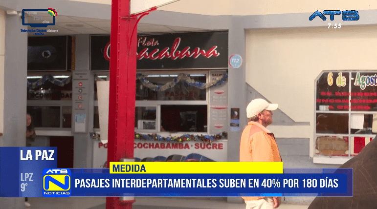 La Paz, 30 de dic 2025 (ATB Digital).- Desde la Terminal de Buses de La Paz se informó que ya se alista el incremento temporal de tarifas en los pasajes interdepartamentales, medida que entrará en vigencia a partir del 2 de enero. Las autoridades indicaron que el ajuste responde a acuerdos con el sector del transporte y tendrá carácter transitorio.