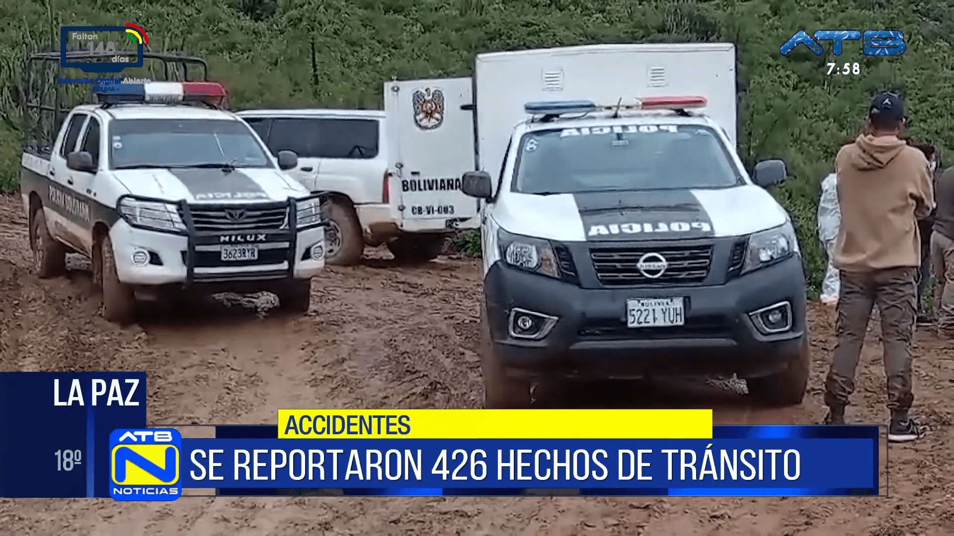 La Paz, 02 de ene 2026 (ATB Digital).- La Dirección Nacional de Tránsito informó que entre el 24 de diciembre de 2025 y el 1 de enero de 2026 se registraron 426 hechos de tránsito en todo el país, con un saldo de 417 personas entre heridas y fallecidas.