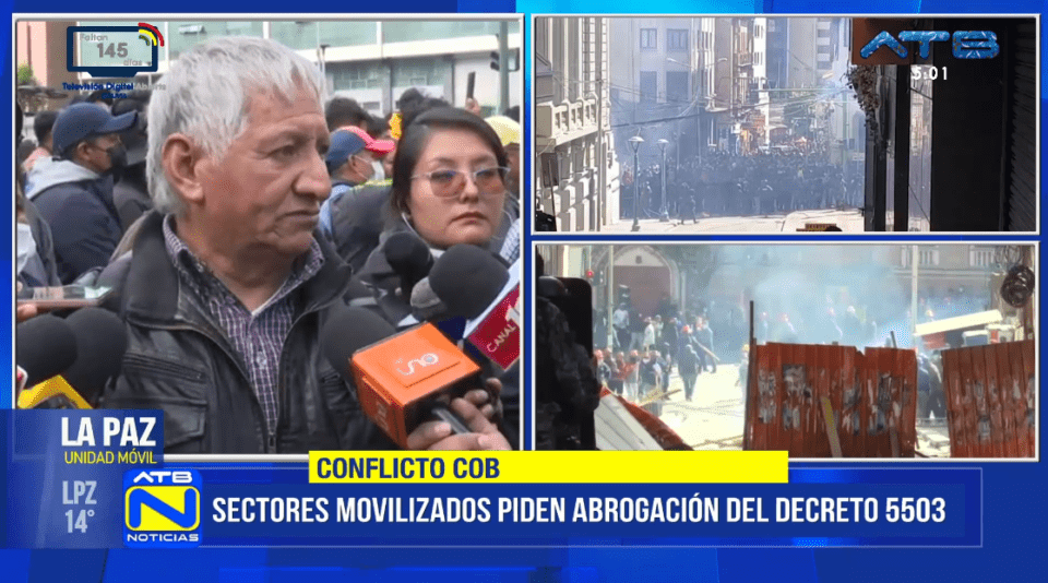 La Paz, 05 de ene 2026 (ATB Digital).- El exejecutivo de la Central Obrera Boliviana (COB), Jaime Solares, se pronunció ante los medios de comunicación para defender las recientes manifestaciones protagonizadas por la COB en el centro de la ciudad de La Paz.