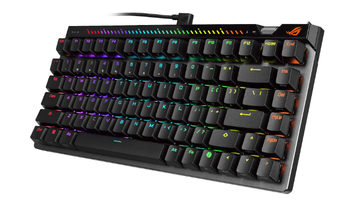 El teclado también integra un botón multifunción y un panel táctil para controles típicos como volumen, reproducción o brillo de la iluminación, con una barra de luz RGB que actúa como feedback visual. ASUS ya venía trabajando ideas similares en modelos compactos anteriores y aquí las encaja en el formato 75% sin sacrificar teclas esenciales.