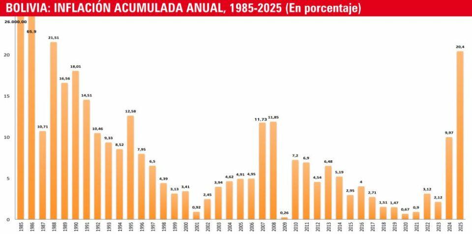 La última vez que Bolivia registró una inflación anual de más de 20% fue en 1988 (21,47), después de la hiperinflación de 1985 cuando se llegó a los 8.171% producto de una crisis económica y un colapso cambiario.