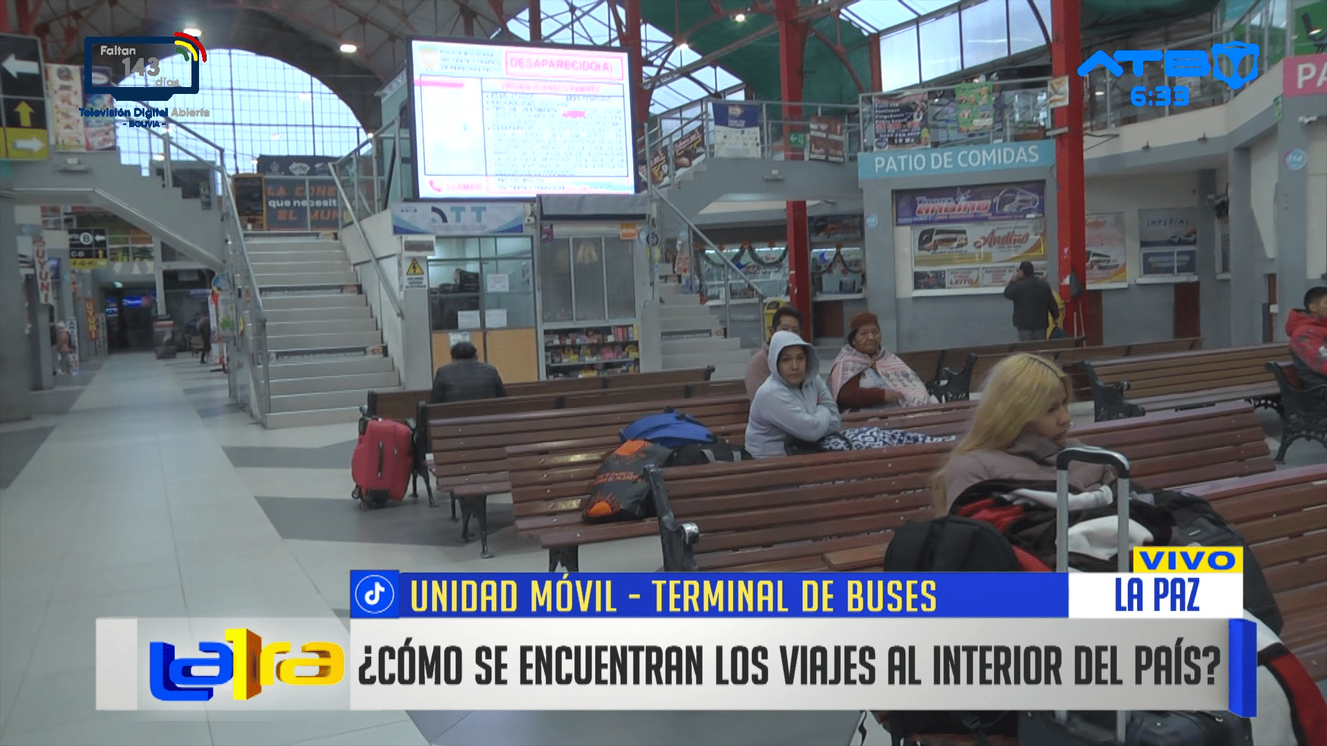 La Paz, 07 de ene 2026 (ATB Digital).- Desde la Terminal de Buses de La Paz se informó que, si bien varios puntos de bloqueo fueron levantados, aún persisten cortes en tramos considerados clave, por lo que se decidió cancelar todas las salidas, incluso por rutas alternas, hasta nuevo aviso. Como medida de precaución, desde ayer no se están vendiendo pasajes a ningún destino.