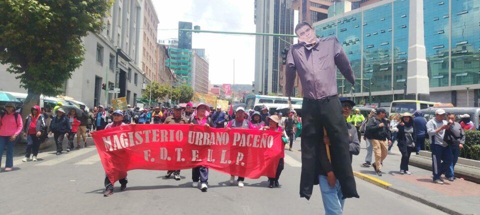 La Paz, 08 de ene 2026 (ATB Digital).- En la jornada de hoy, maestros se movilizan en el centro paceño portando un muñeco que representa al presidente Rodrigo Paz acompañado de un personaje de la Muerte, en el marco de sus protestas por el Decreto Supremo 5503. La movilización avanza por calles céntricas, llamando la atención de transeúntes y autoridades.