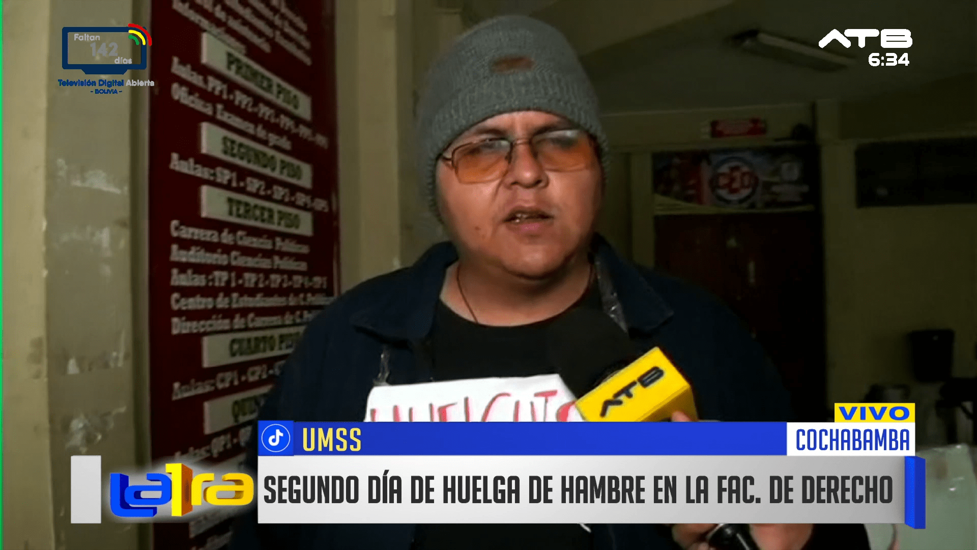 Cochabamba, 08 de ene 2026 (ATB Digital).- Desde Cochabamba, estudiantes cumplen el segundo día de huelga de hambre en rechazo al incremento del costo de la matrícula para la modalidad de admisión especial en la Universidad Mayor de San Simón (UMSS), exigiendo que se mantengan los montos anteriores.