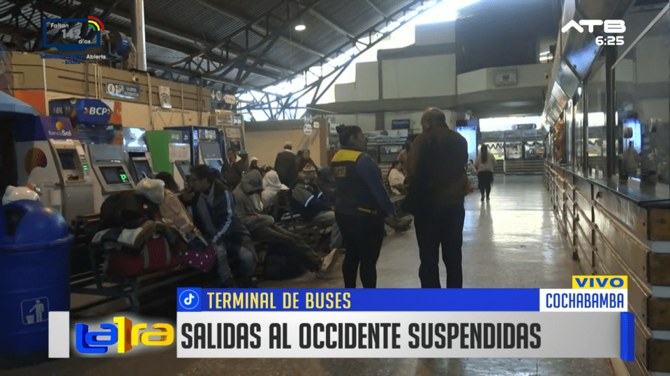 Cochabamba, 08 de ene 2026 (ATB Digital).- Desde la terminal de buses de Cochabamba no se registran salidas hacia La Paz debido a los bloqueos. Las rutas hacia Oruro se encuentran habilitadas, pero no hay despachos programados, mientras que los viajes al oriente se realizan por la carretera antigua a causa de trabajos en la vía principal. Ante este panorama, varias empresas suspendieron la venta de pasajes y en la terminal se observa una muy baja afluencia de pasajeros.