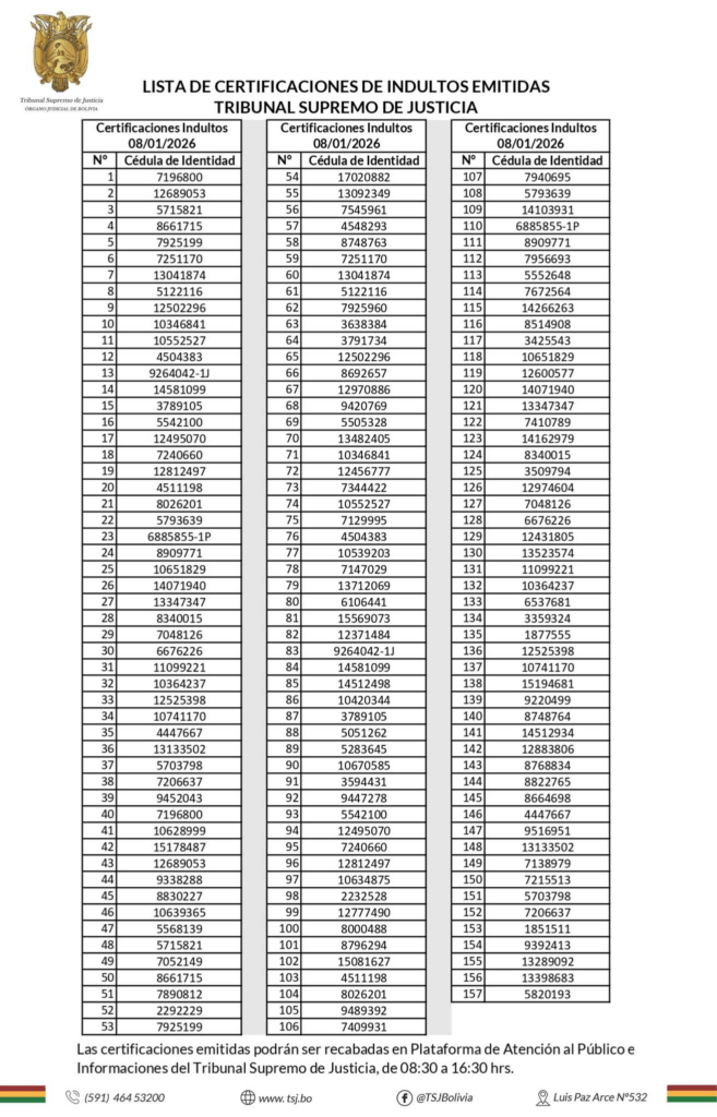 La Paz, 8 de ene 2026 (ATB Digital) .- El Tribunal Supremo de Justicia (TSJ) publicó la segunda lista de certificaciones de indulto, dando cumplimiento al Decreto Supremo 5460 de octubre de 2026.
