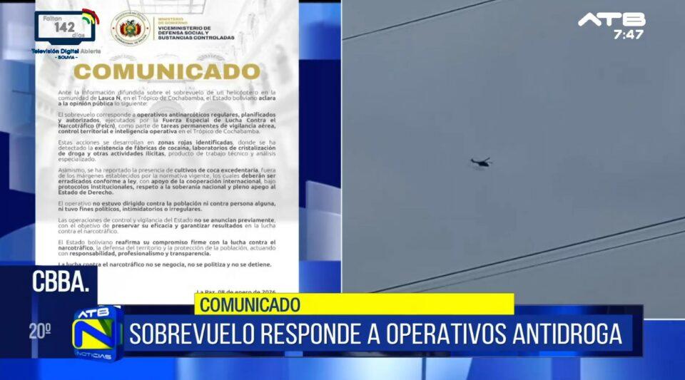 Cochabamba, 08 de ene 2026 (ATB Digital).- El Viceministerio de Defensa Social y Sustancias Controladas aclaró que la presencia de un helicóptero sobre Lauca Ñ, en el Trópico de Cochabamba, forma parte de tareas de vigilancia aérea en zonas calificadas como rojas y no busca afectar a la población ni tiene fines políticos o intimidatorios.