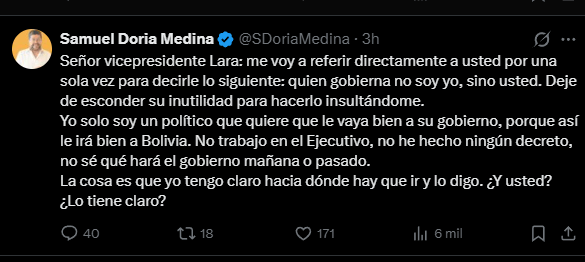En ese contexto, Doria Medina señaló que el vicepresidente debería asumir su rol y dejó entrever críticas a la gestión gubernamental, afirmando que Lara estaría “escondiendo su inutilidad para gobernar” mediante ataques personales.