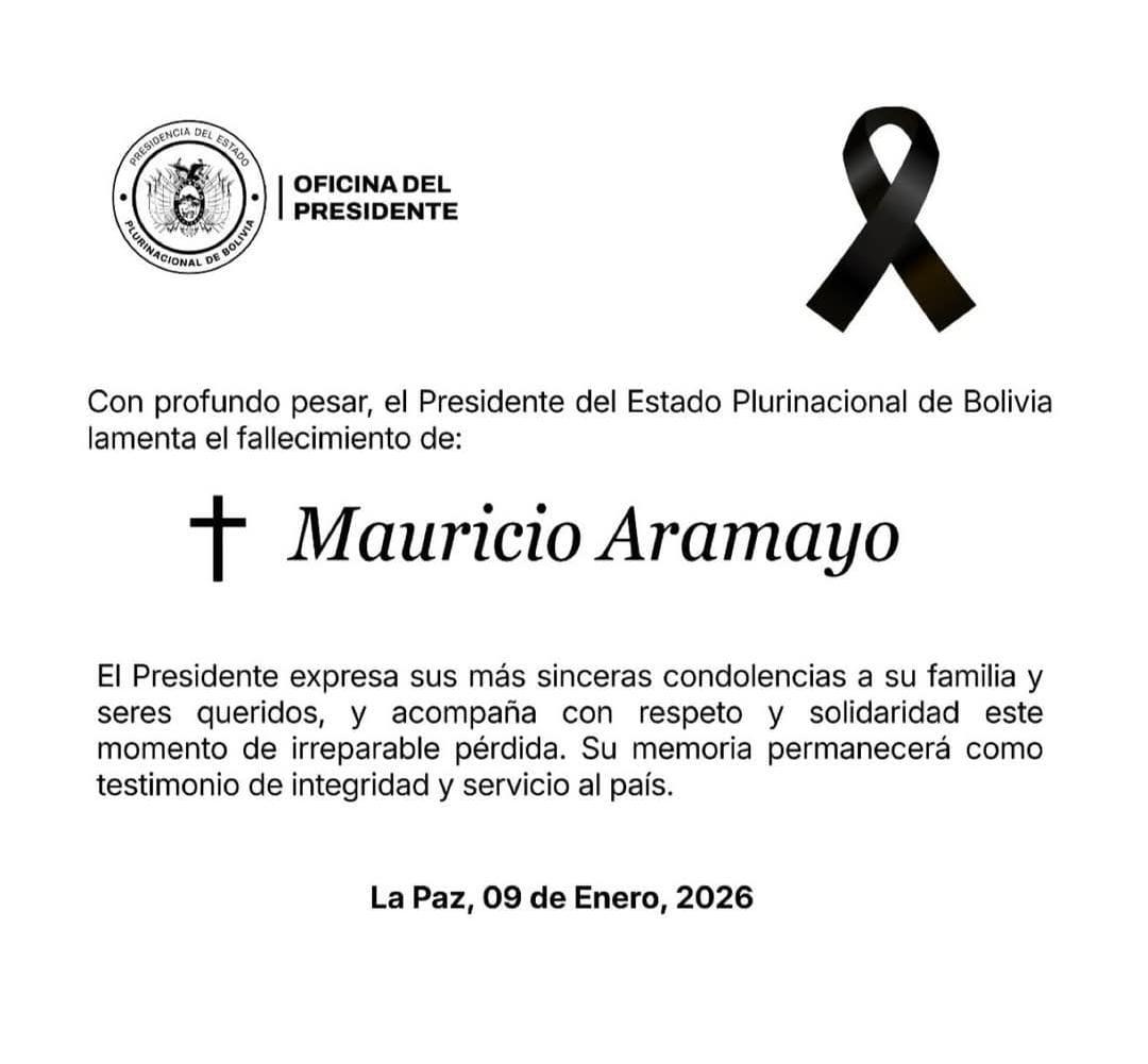La Paz, 09 de ene 2026 (ATB Digital).- El Presidente del Estado Plurinacional de Bolivia expresó su profundo pesar por el fallecimiento de Mauricio Aramayo, transmitiendo sus condolencias a la familia y seres queridos. En un comunicado oficial, destacó la integridad y servicio de Aramayo al país, señalando que su memoria permanecerá como testimonio de su legado.