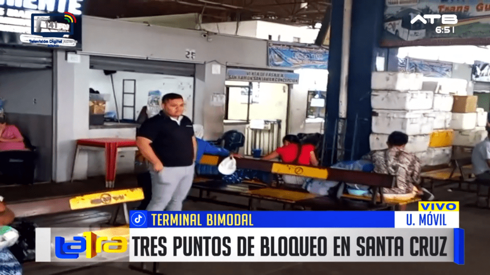 Santa Cruz, 09 de ene 2026 (ATB Digital).- Desde la Terminal Bimodal de Santa Cruz se reporta la suspensión de salidas debido a tres puntos de bloqueo en el departamento. La población permanece a la espera de reanudar sus viajes, mientras comerciantes y transportistas advierten que la mercadería comienza a deteriorarse por la paralización del transporte.
