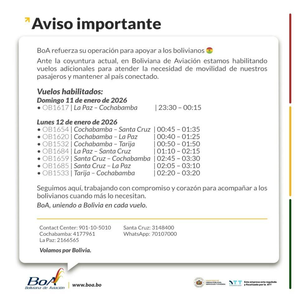 La Paz, 11 de ene 2026 (ATB Digital).- Boliviana de Aviación (BoA) informó que reforzó su operación con la habilitación de vuelos adicionales ante la coyuntura actual marcada por los bloqueos de carreteras en distintas regiones del país, con el objetivo de garantizar la movilidad de los pasajeros y mantener la conectividad entre las principales ciudades.