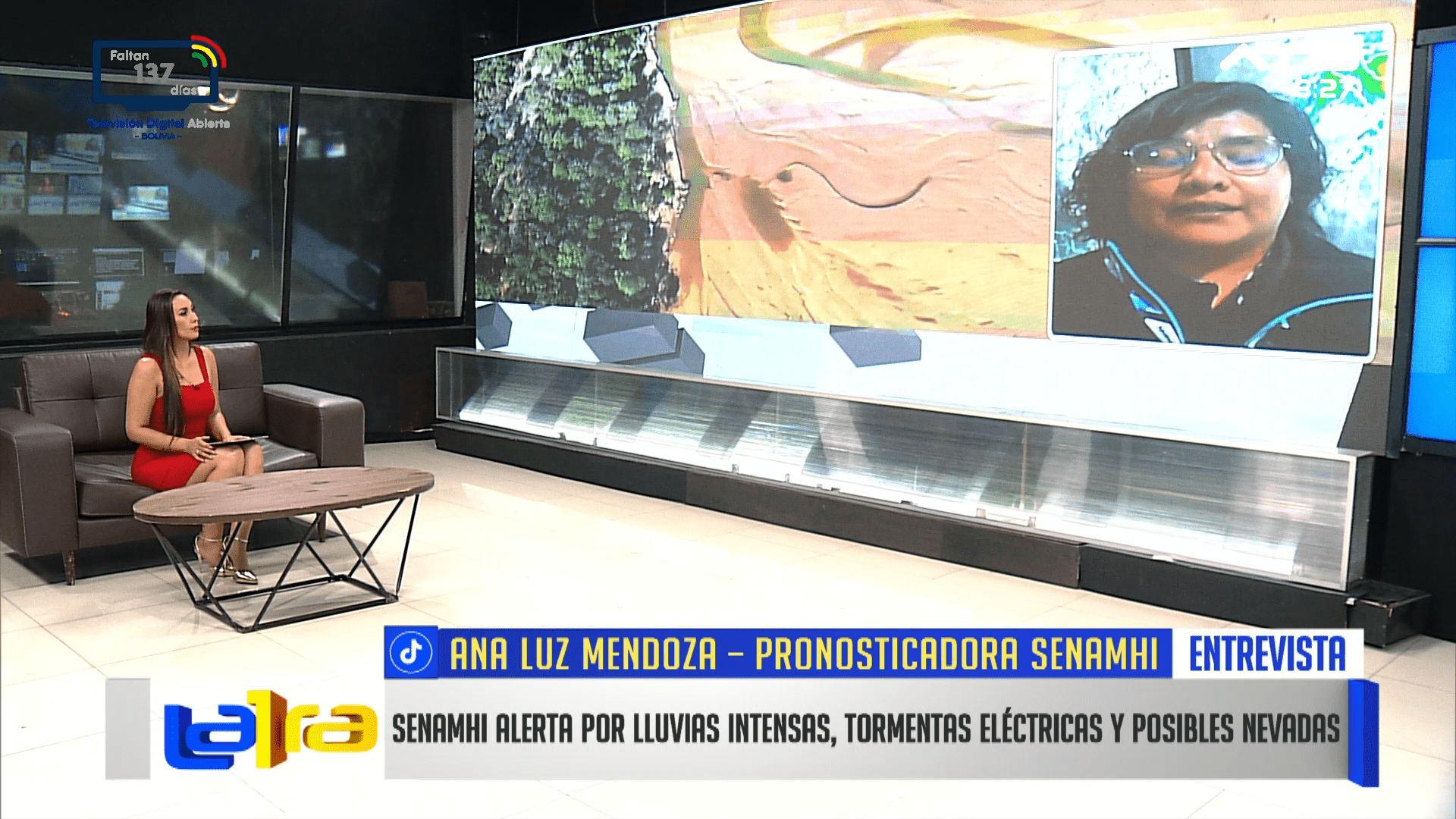 La Paz, 13 de ene 2026 (ATB Digital).- Ana Luz Mendoza, pronosticadora del Servicio Nacional de Meteorología e Hidrología (SENAMHI), informó que se mantiene una alerta meteorológica a nivel nacional por lluvias intensas, tormentas eléctricas y la posibilidad de nevadas en distintas regiones del país.