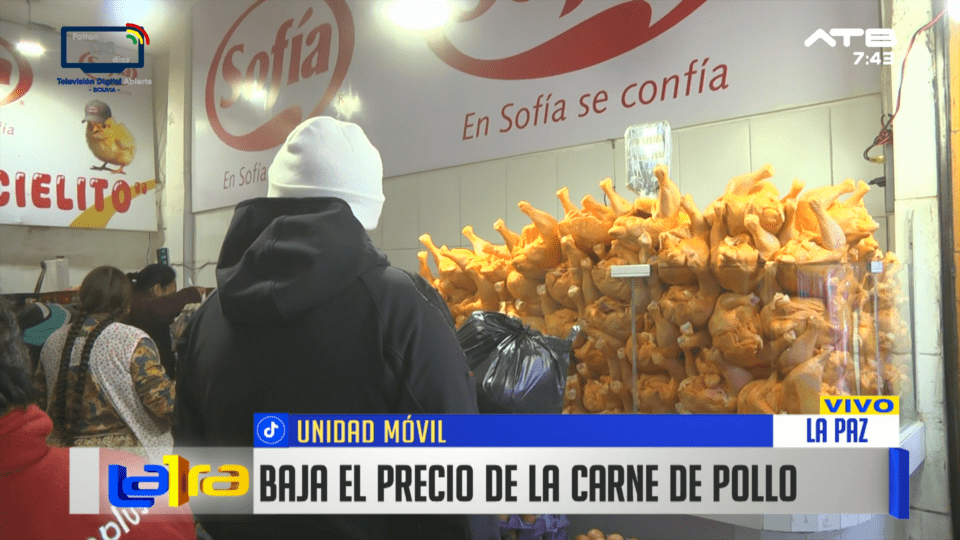 La Paz, 14 de ene 2026 (ATB Digital).- El precio del pollo registró una reducción y actualmente se comercializa a 19 bolivianos el kilo, situación que generó largas filas de personas en la zona de la Garita de Lima, en la ciudad de La Paz. La población acudió desde tempranas horas para aprovechar el descenso en el costo del producto, ante la expectativa de asegurar el abastecimiento de este alimento de consumo básico.